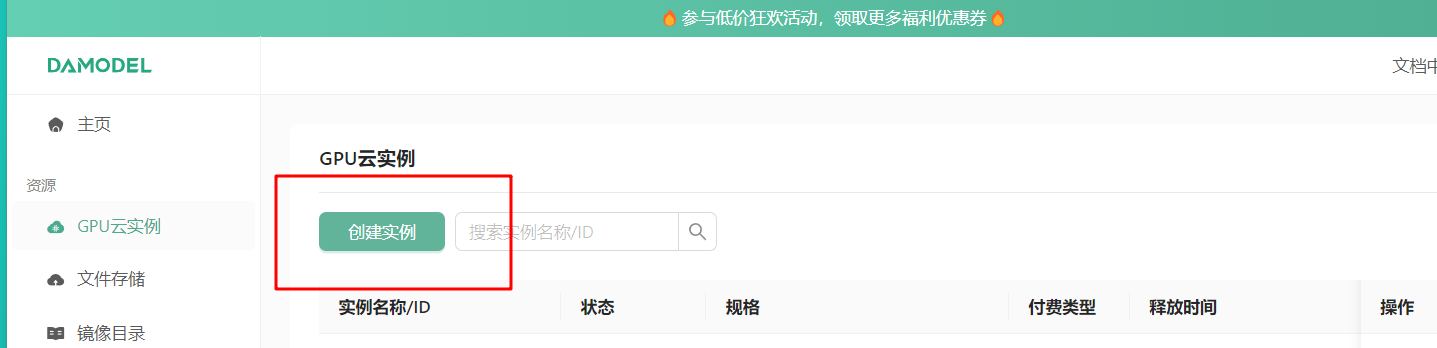 首先进入控制台,选择GPU云实例,点击创建实例: