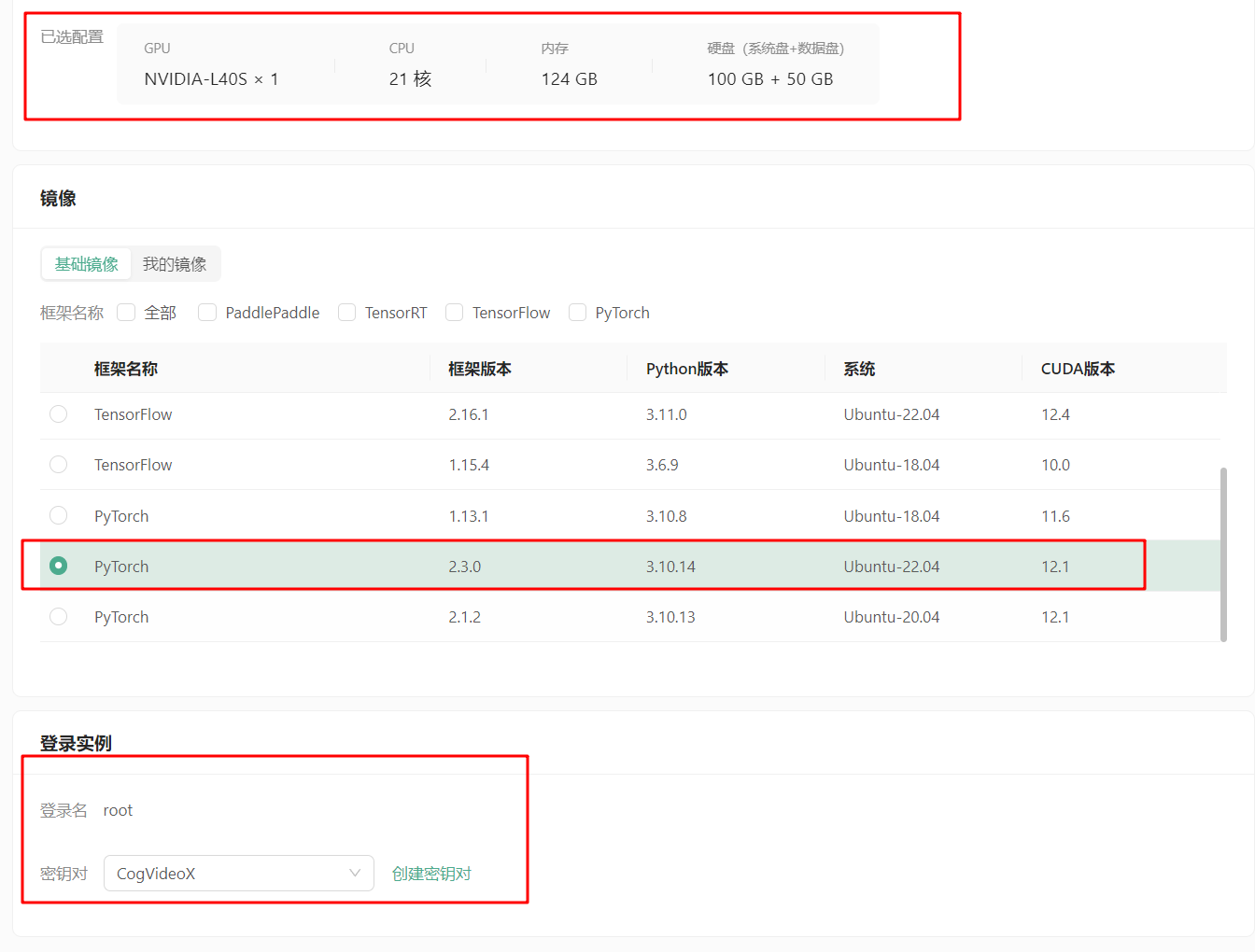 由于CogVideoX在FP-16 精度下的推理至少需 18GB 显存,微调则需要 40GB 显存,我们这里可以选择L40S显卡(推荐)或者4090显卡,硬盘可以选择默认的100GB系统盘和50GB数据盘,镜像选择PyTorch2.3.0、Ubuntu-22.04,CUDA12.1镜像,创建并绑定密钥对,最后启动。