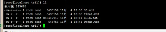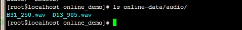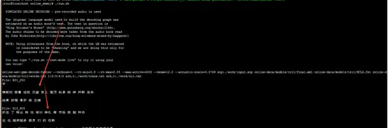 [root@localhost online_demo]# ./run.sh 模型识别的是 /mnt/kaldi-master/egs/thchs30/online_demo/online-data/audio路径下所有的单音频文件