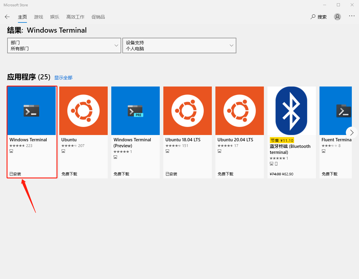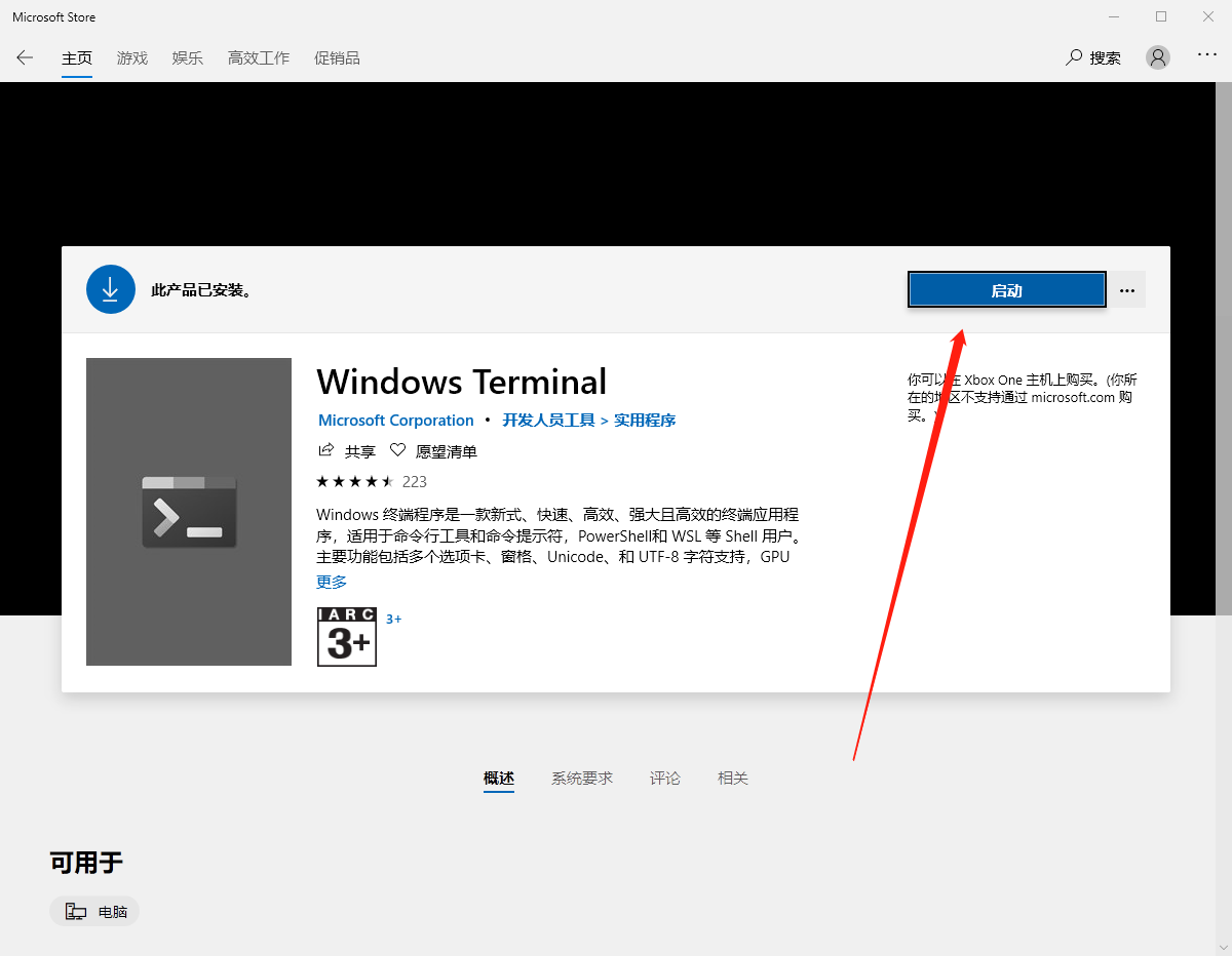 打开windows的商店——>搜索'Windows Terminal'——>进入到详情页——>点击'获取'(如果安装过那就是启动)