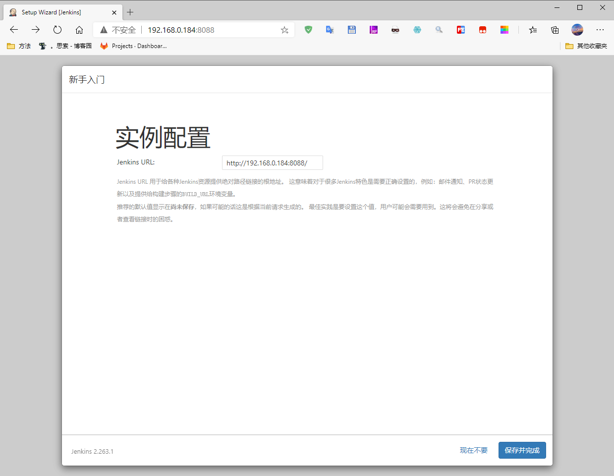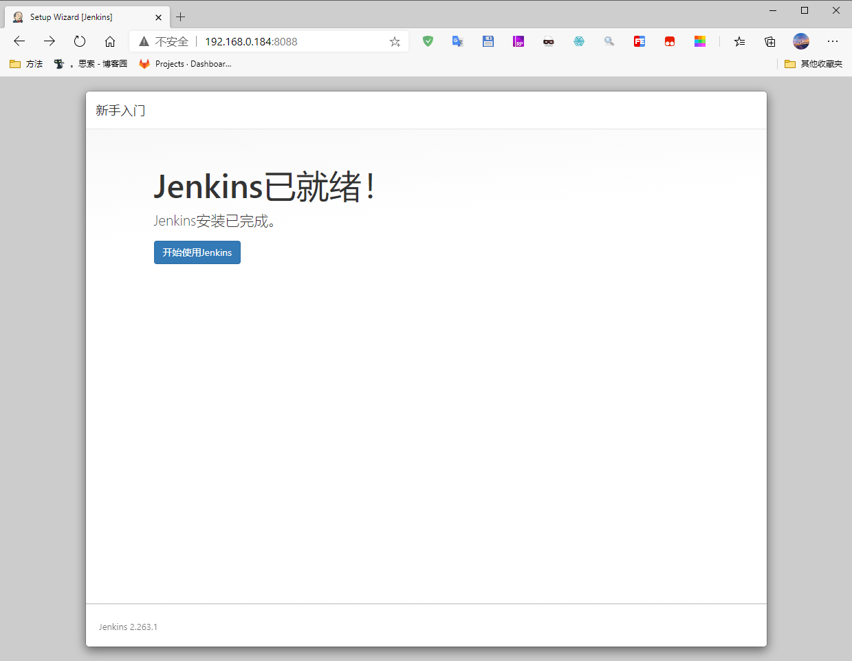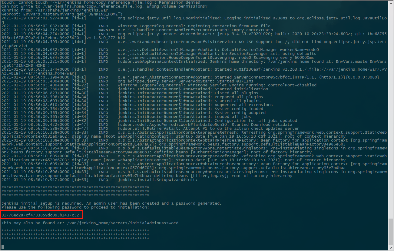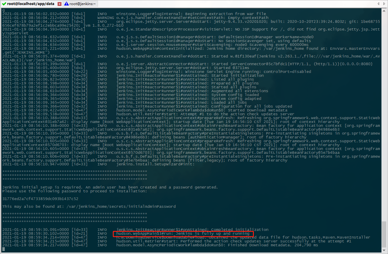 Jenkins完全启动时会打印一条Jenkins is fully up and running日志,看到此日志就可以开始配置Jenkins了。