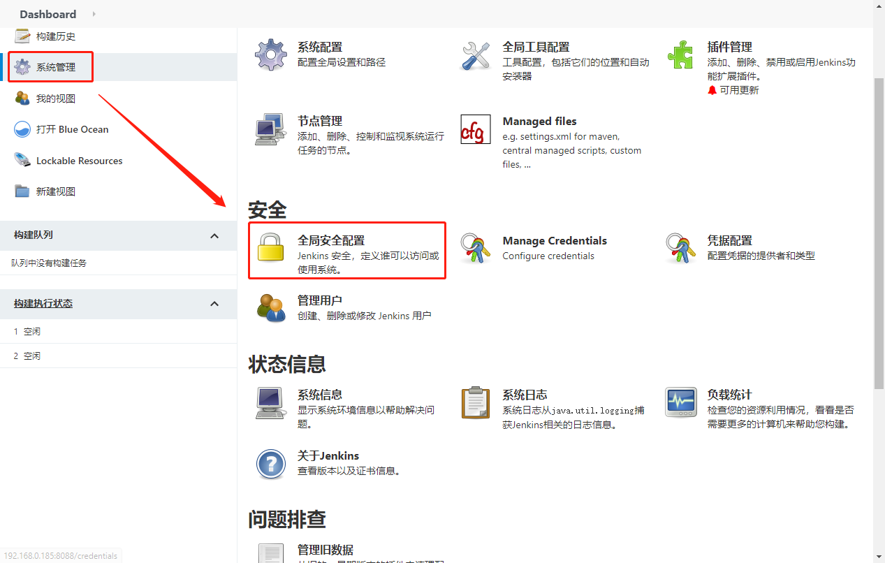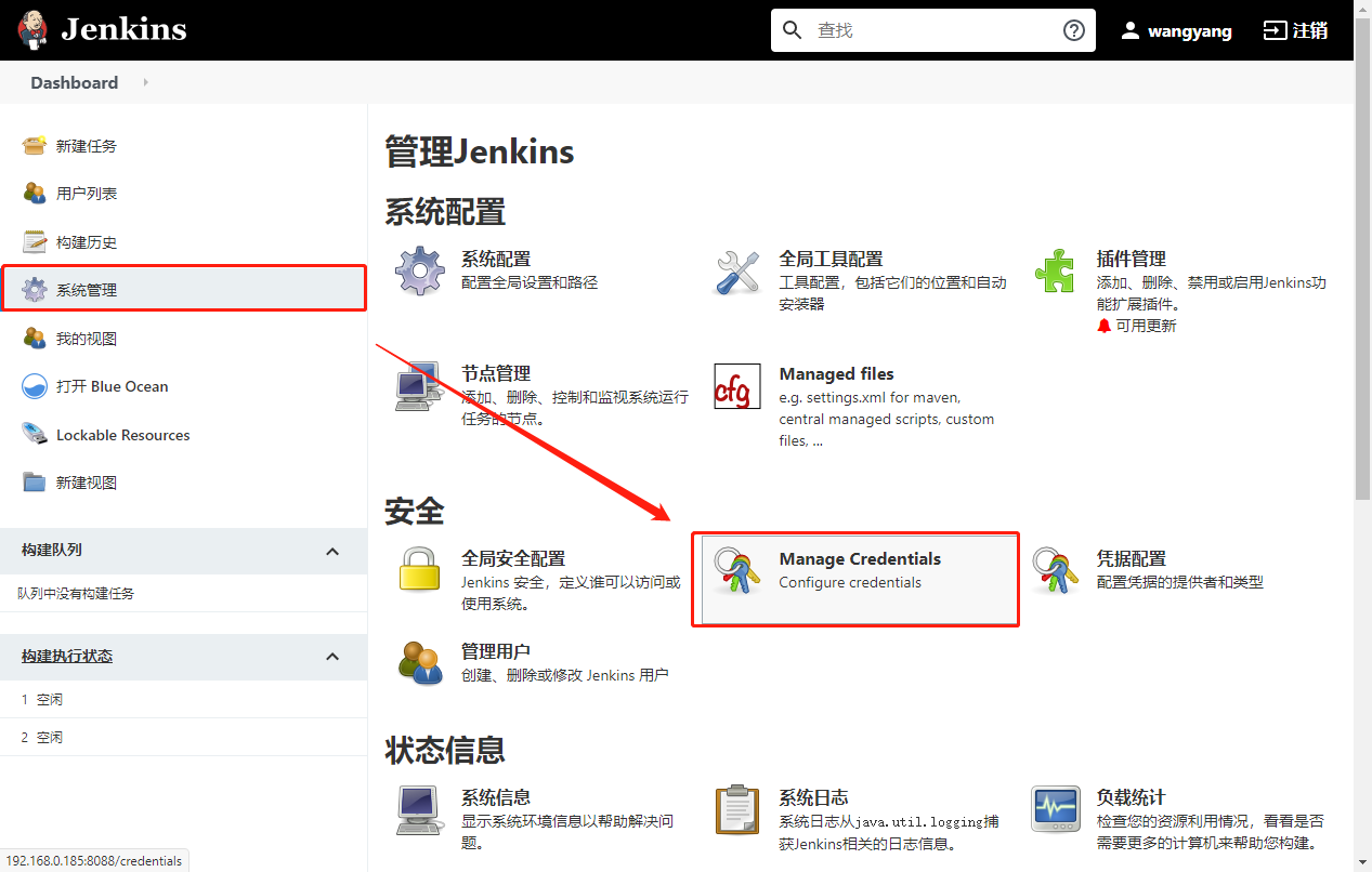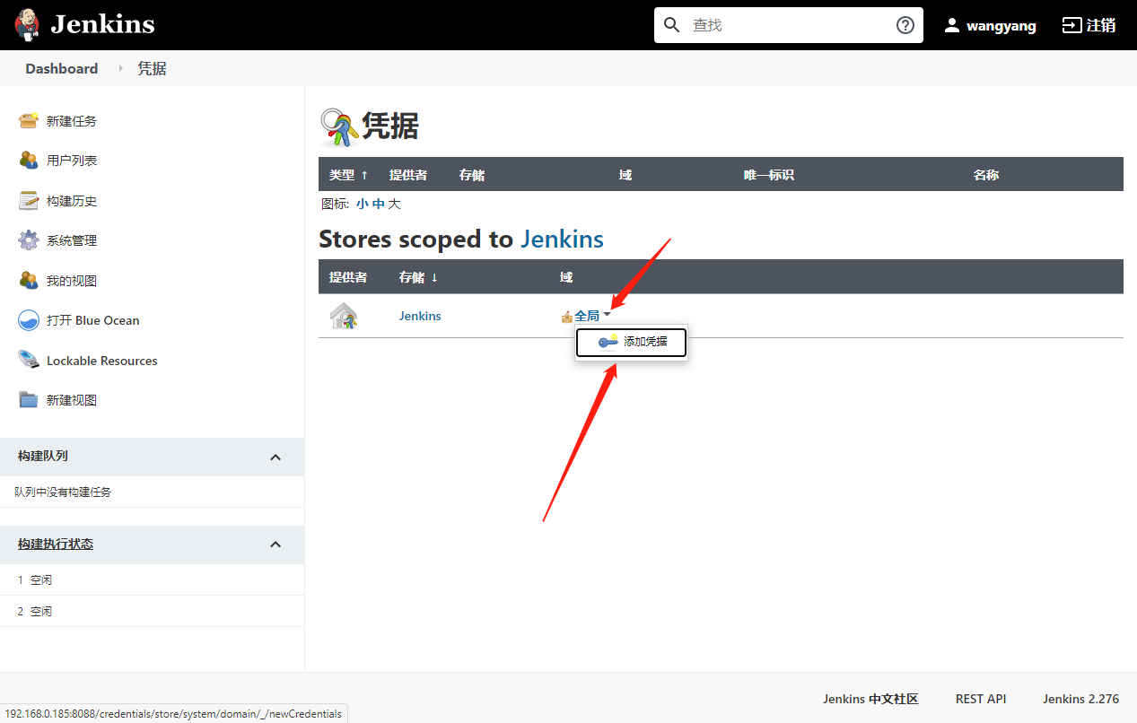 Jenkins提供凭据管理的功能来帮助我们存放涉密账号密码、私钥等信息,在配置Pipeline前我们需要创建好相关凭据。