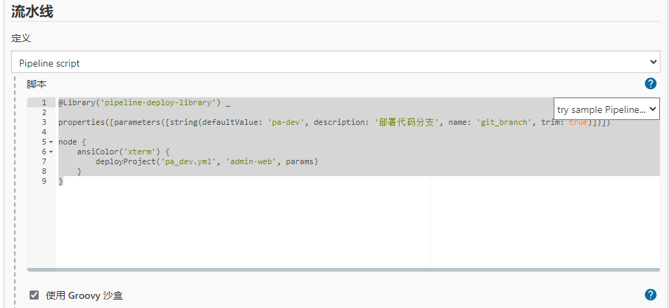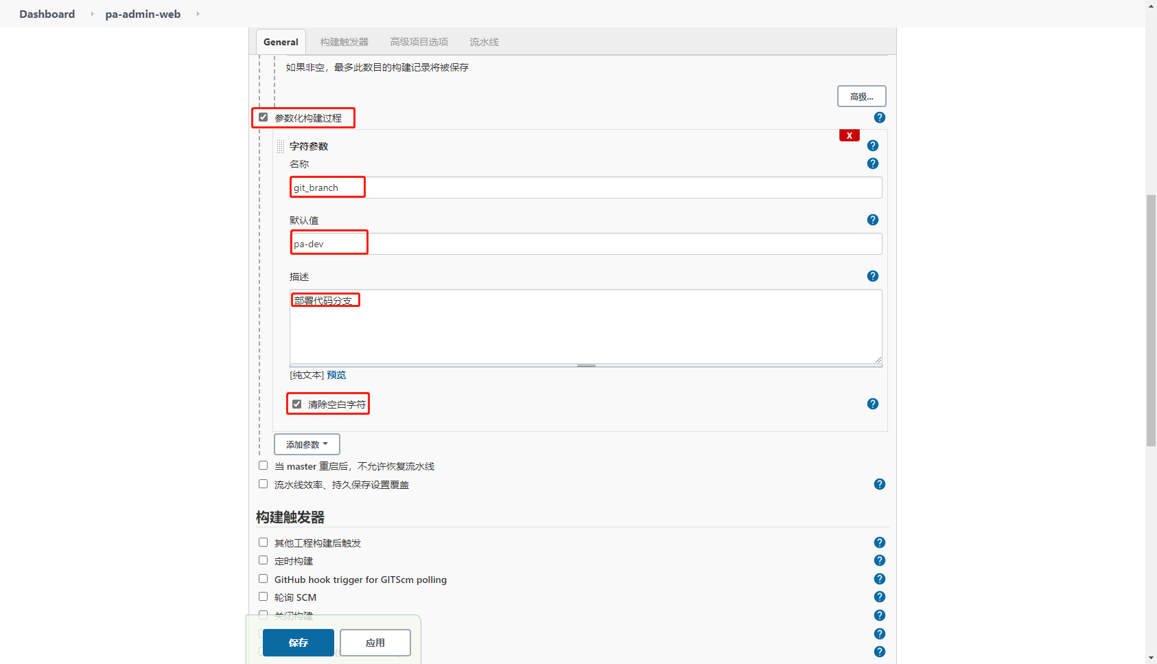 properties([parameters([string(defaultValue: 'pa-dev', description: '部署代码分支', name: 'git_branch', trim: true)])])