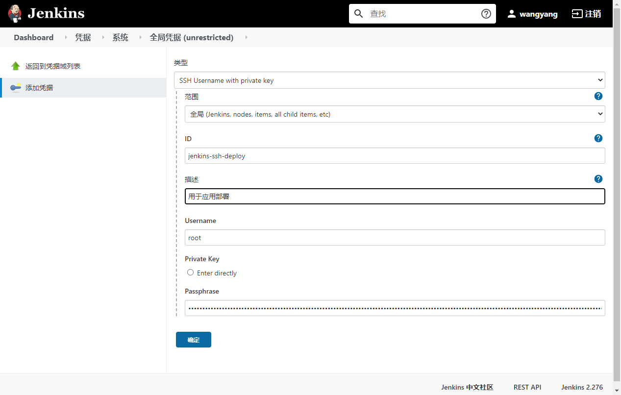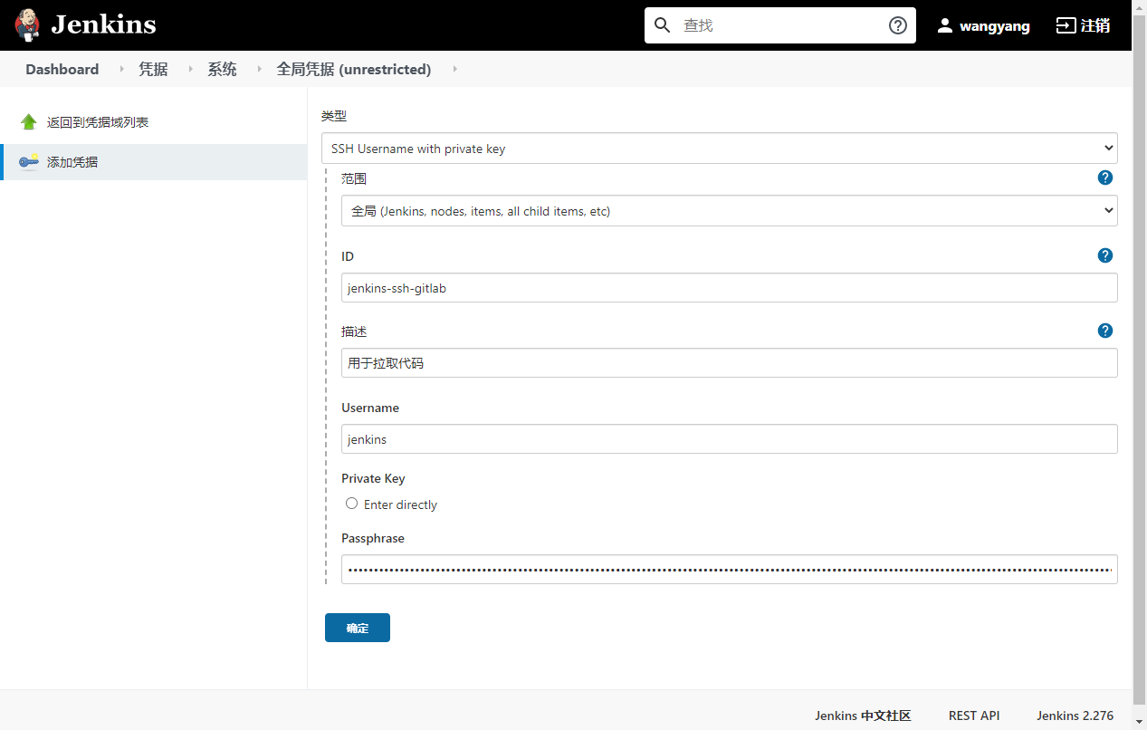 在Jenkins界面上系统管理->管理凭据`中创建以下全局ssh密钥对凭据,填写好ID、描述、用户名和私钥信息