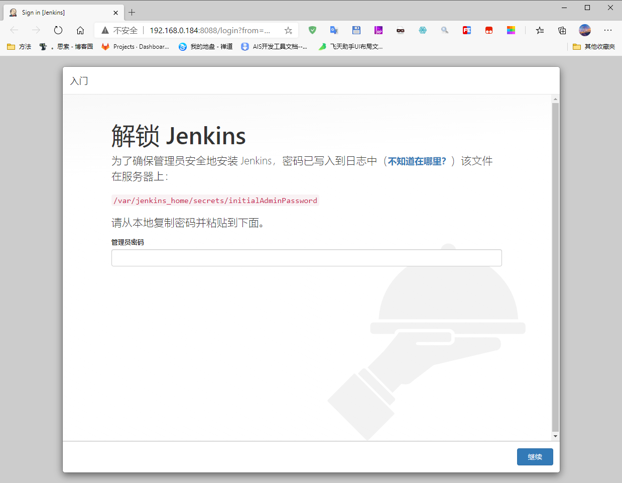 输入刚才在日志中得到的密码来激活Jenkins
