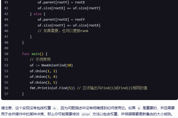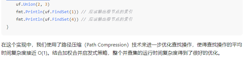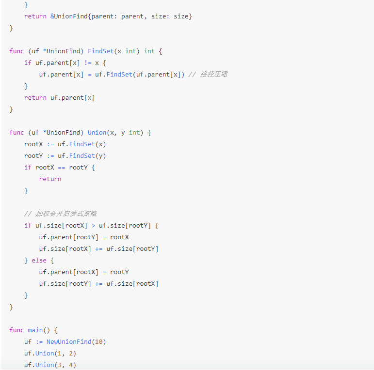 }在这个代码中,NewUnionFind函数初始化了一个包含n个元素的并查集,Find函数实现了路径压缩的查找操作,Union函数实现了加权合并启发式策略的合并操作。