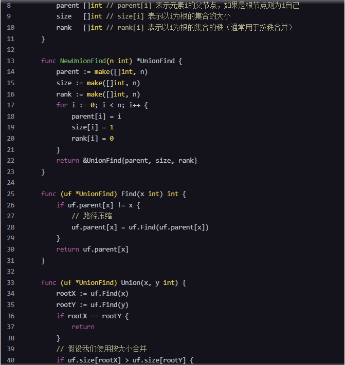 rank []int // rank[i] 表示以i为根的集合的秩(通常用于按秩合并)