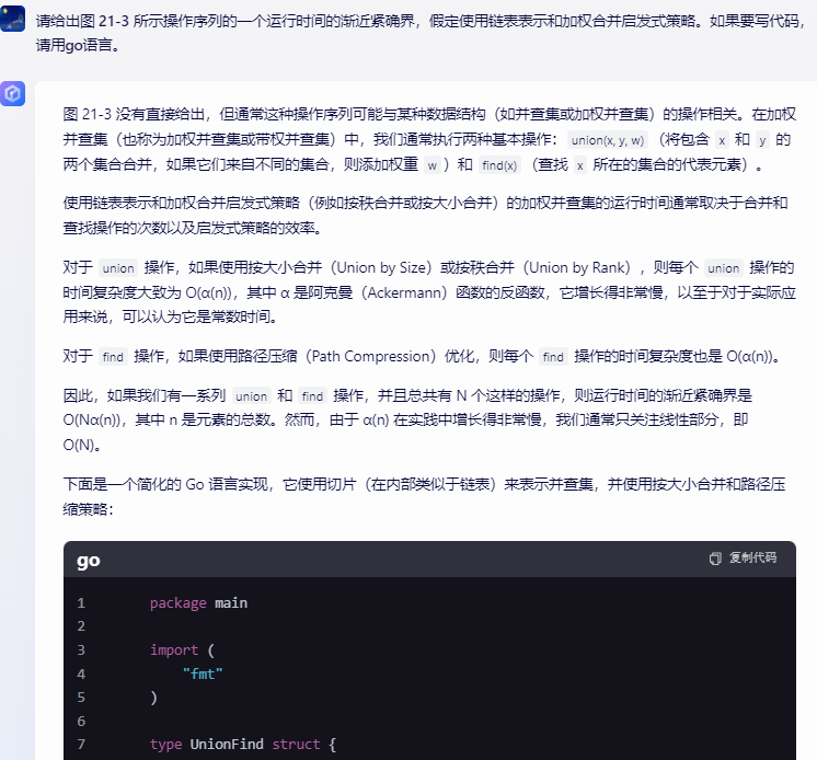 四、请给出图 21-3 所示操作序列的一个运行时间的渐近紧确界,假定使用链表表示和加权合并启发式策略。如果要写代码,请用go语言。