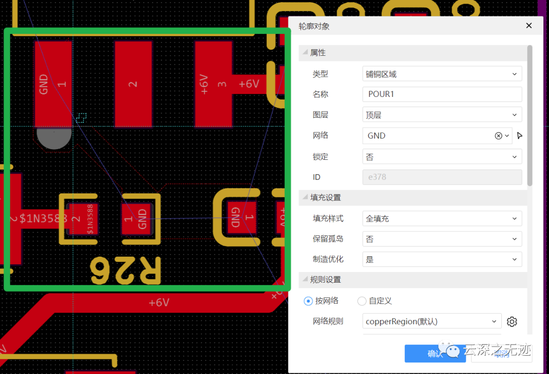 注意这个地方说的是!!!在空闲的位置,就是正好几个元件的GND在一块,其实在布局的时候也要有意识的去摆放。这个时候就铺一下。然后铺的时候或者是看见GND就赶紧打个孔下去,你放心,你还看我的文章,证明你还没有到玩高速的段位,无所吊谓的,打孔就对了。