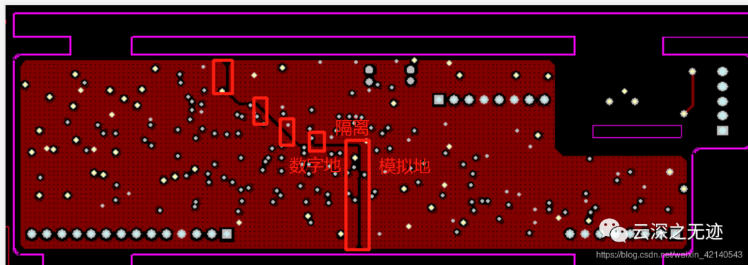 数字地、模拟地和保护地要分开,并且保持2.5mm间距;数字地、模拟地保持1mm的间距。