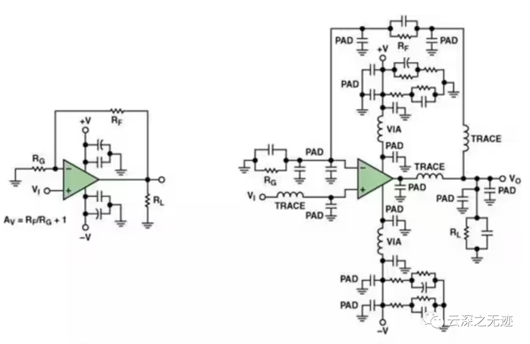 寄生效应就是那些溜进你的PCB并在电路中大施破坏、头痛令人、原因不明的小故障(按照字面意思)。它们就是渗入高速电路中隐藏的寄生电容和寄生电感。其中包括由封装引脚和印制线过长形成的寄生电感;焊盘到地、焊盘到电源平面和焊盘到印制线之间形成的寄生电容;通孔之间的相互影响,以及许多其它可能的寄生效应。图3(a)示出了一个典型的同相运算放大器原理图。但是,如果考虑寄生效应的话,同样的电路可能会变成图3(b)那样。