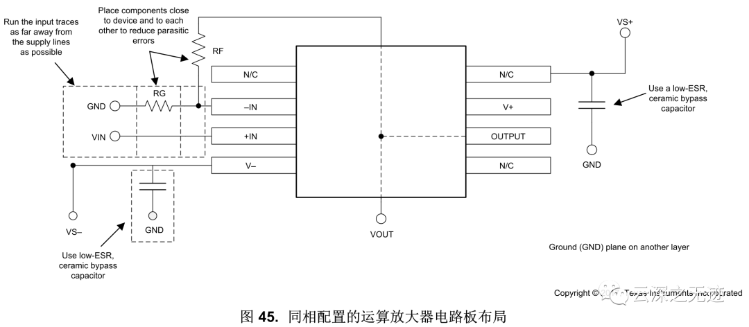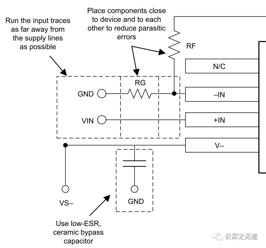 直接从运算放大器的电源引脚入手;具有最小电容值和最小物理尺寸的电容器应当与运算放大器置于PCB的同一面——而且尽可能靠近放大器。