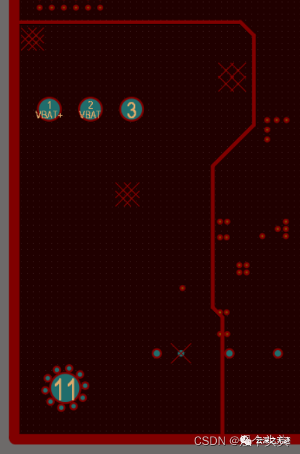 还有就是我以为4层板的电源是一定要走到稍微的电源层的,其实不是,实现PCB走线的第一个点就是将对应的地方联通就行!!!这个教程里面我如果没有看错,电源就没有走电源层,就是上下俩层来回走。但是有的也说电源优先走电源层,但是一些小电流电源可能会走到信号层。