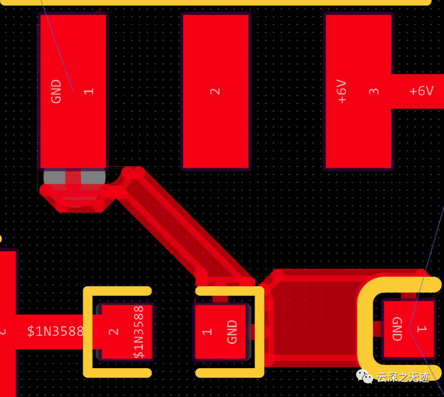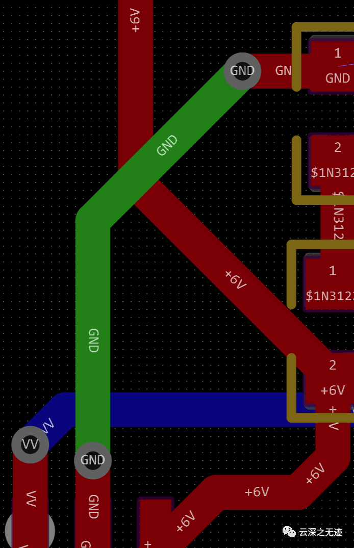还有就是多层板走线的时候,是看不见除了自己当前层之外的层里面的这个位置有没有东西的,你打个孔就不一样了。