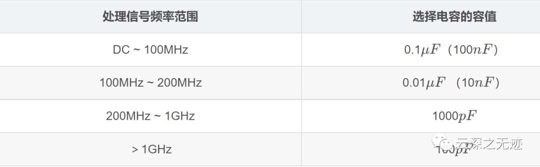 电容器的电容值应该根据处理信号的频率按以下的标准确定(下列值是根据经验得出的)。