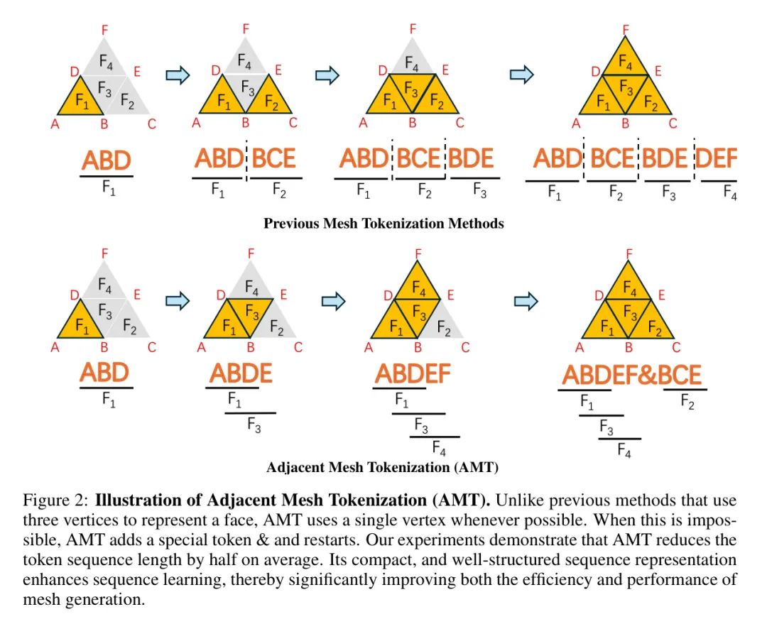 如图2所示:相邻网格标记化(AMT)的说明。与使用三个顶点表示一个面的先前方法不同,在可能的情况下,AMT使用单顶点。当这样做不现实时,AMT增加一个特殊的标记符"&"并重新开始。作者的实验表明,AMT平均将标记序列长度减少一半。其紧凑且有结构的序列表示增强了序列学习,从而显著提高了网格生成的效率和性能。