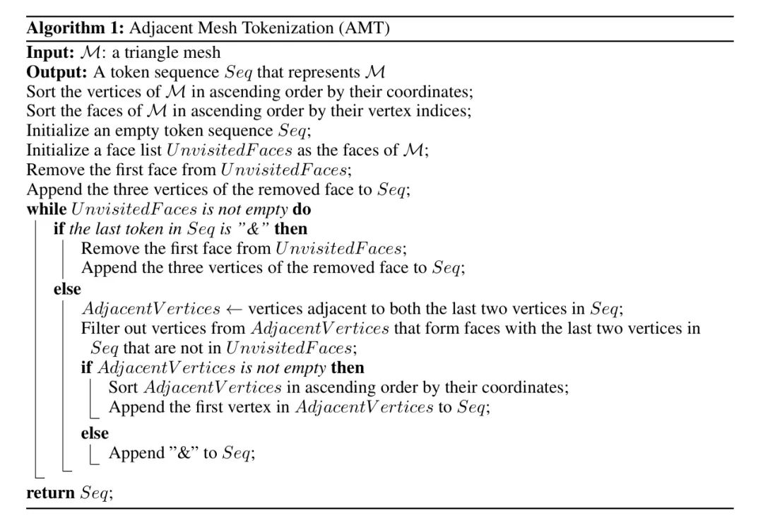 为了解决这个问题,作者提出了相邻网格标记化(AMT)方法,以获得比先前方法更紧凑且结构良好的 。作者的关键观察是, 的主要冗余来自用三个顶点表示每个面,如等式 2 所示,这导致已经访问过的顶点在 中冗余出现。因此,AMT 的目标是尽可能只用一个顶点表示每个面。如图2 和算法 1 所示,AMT 在标记化过程中有效地编码相邻面,只使用一个额外的顶点。当没有相邻面可用时,如图2 的最后一步所示,AMT 在序列中插入特殊标记“&”以表示这一事件,并从尚未编码的面开始重新启动过程。(3)