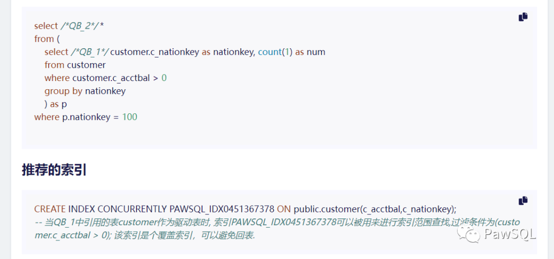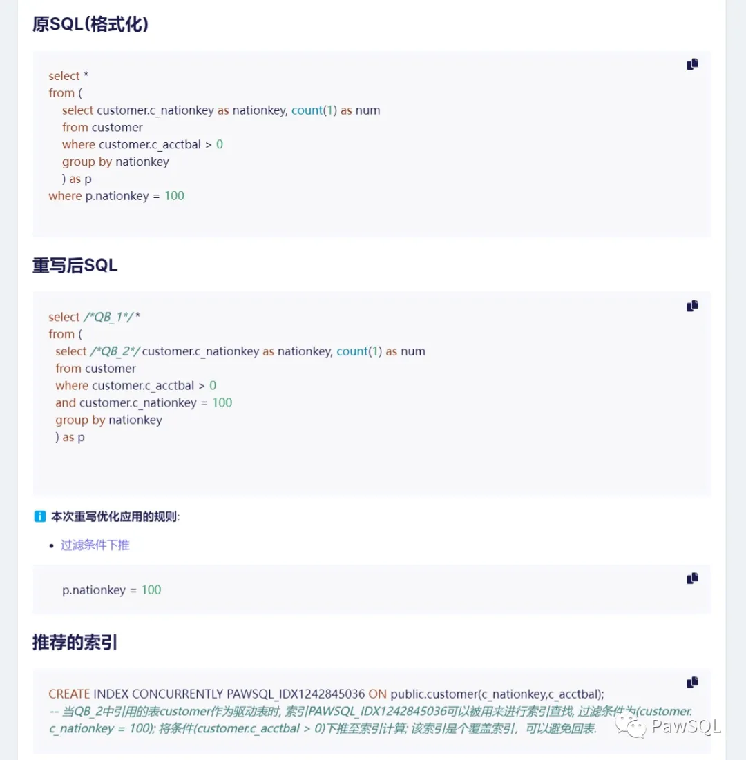 类似的,能够帮助PawSQL索引引擎推荐更有效的索引的重写优化算法还包括:LIMIT子句下推重写优化,外连接转化为内连接优化,投影下推优化,SATTC优化等等。