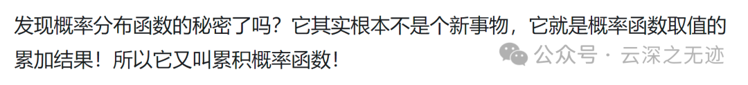 发现概率分布函数的秘密了吗?它其实根本不是个新事物,它就是概率函数取值的累加结果!所以它又叫累积概率函数!