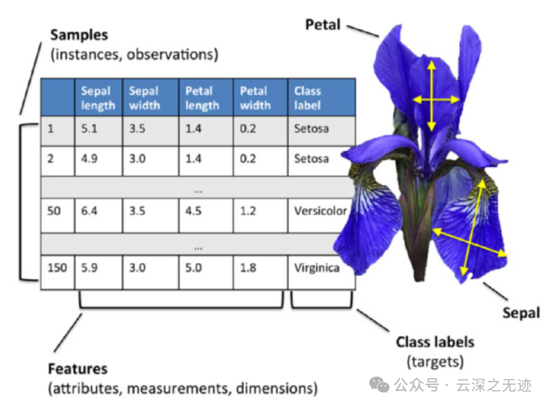 鸢尾花数据集共收集了三类鸢尾花,即Setosa鸢尾花、Versicolour鸢尾花和Virginica鸢尾花,每一类鸢尾花收集了50条样本记录,共计150条。
