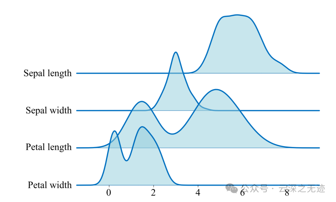 山脊图 (ridgeline plot) 是由多个重叠的概率密度线图构成,这种可视化方案形式上紧凑。山脊图的基本思想是,将数据沿着 y 轴的方向上的一条带状区间内进行展示,使得数据的分布曲线能够清晰地显示出来,并且不会重叠和遮挡。在山脊图中,每个变量的分布曲线通常用核密度估计法或直方图法进行估计,然后按照一定的顺序进行平移和叠加。
