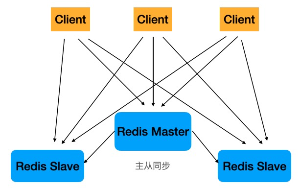 系统中只有一个redis服务器,所有请求都打到这一台机器上。 随着业务发展,整个系统对redis读的请求量逐渐增加,一台机器逐渐扛不住,所以我们增加了两台从库来分担主库读压力,所以又有了主从架构