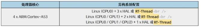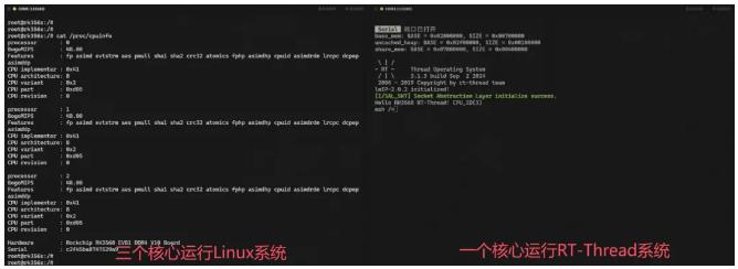该方案能够同时满足实时应用和非实时应用的需求。某些任务可以运行在 Linux 分区,充分利用 Linux 丰富的社区资源和驱动支持。而对于那些对系统实时性和稳定性要求更高的任务,则可以在独立的 RT-Thread 分区中运行,与 Linux 系统相隔离,以确保系统的安全性和关键任务的稳定执行。 烧写支持RT-Thread的AMP系统后,通过串口终端可以看到Linux系统和RT-Thread系统已经同时运行了,其中CPU0、CPU1、CPU2运行Linux系统,CPU3运行RT-Thread系统,如下图所示: