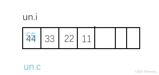}首先两个成员的地址输出来是一样的,其次un.c会和un.i共用一块空间,un.c覆盖了un.i的一部分