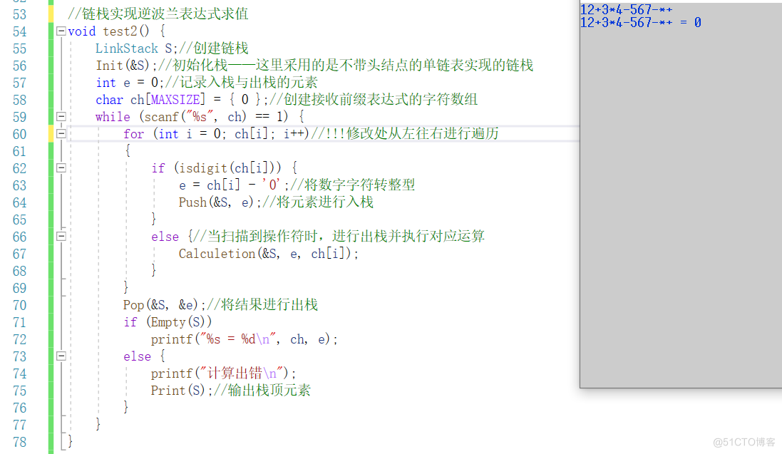 前面我们已经介绍过了,在实现波兰表达式时我们是从右往左进行的扫描,而逆波兰表达式则刚好相反,也就是需要从左往右进行扫描,在扫描的过程中,算法实现的操作是一样的,唯一的不同是此时我们不需要计算字符串的长度,我们可以直接通过字符串结束标志'\0'来作为循环的判断条件。下面我们直接来看对应的代码:
