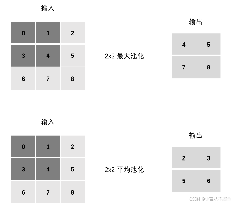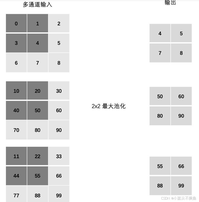 在处理多通道输入数据时,池化层对每个输入通道分别池化,而不是像卷积层那样将各个通道的输入相加。这意味着池化层的输出和输入的通道数是相等。
