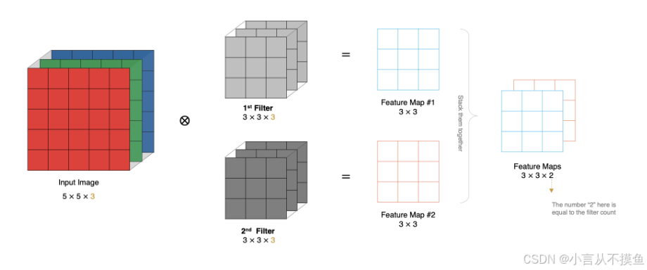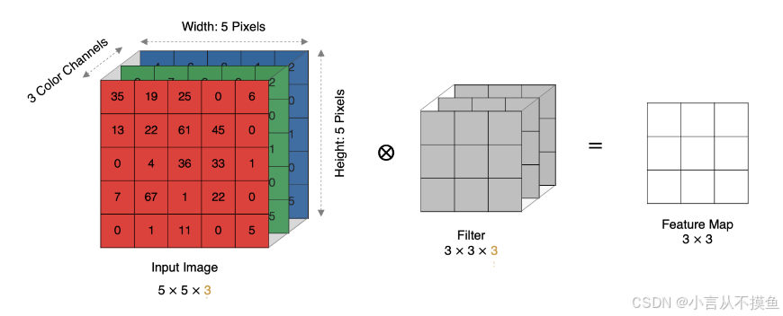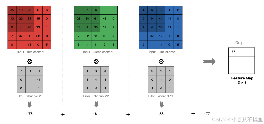 计算方法如下: 1. 当输入有多个通道(Channel), 例如 RGB 三个通道, 此时要求卷积核需要拥有相同的通道数数. 2. 每个卷积核通道与对应的输入图像的各个通道进行卷积. 3. 将每个通道的卷积结果按位相加得到最终的特征图.