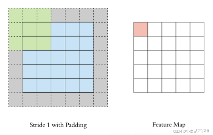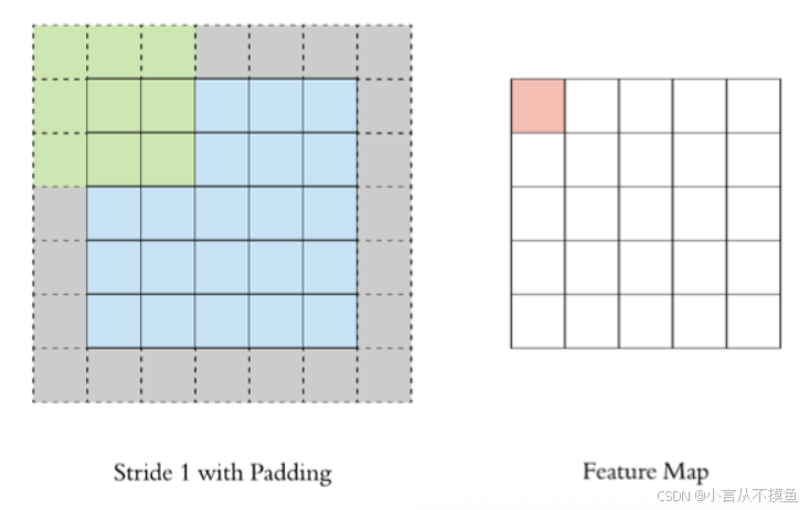通过上面的卷积计算过程,我们发现最终的特征图比原始图像小很多,如果想要保持经过卷积后的图像大小不变, 可以在原图周围添加 padding 来实现.