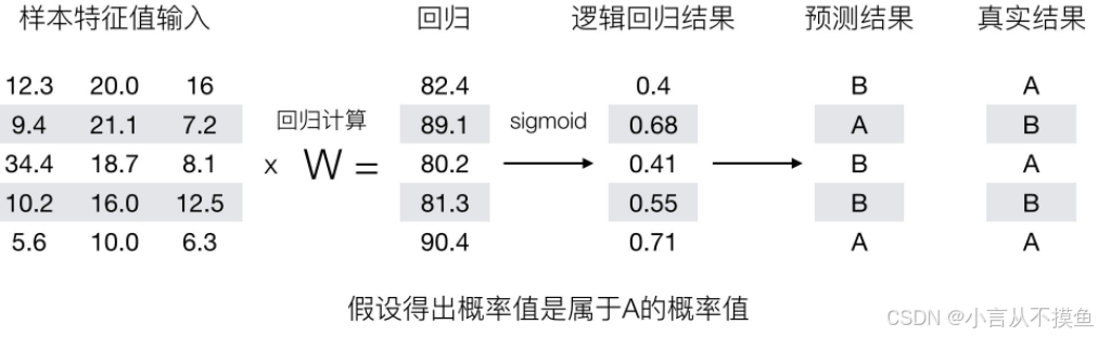 输出结果解释(重要):假设有两个类别A,B,并且假设我们的概率值为属于A(1)这个类别的概率值。现在有一个样本的输入到逻辑回归输出结果0.55,那么这个概率值超过0.5,意味着我们训练或者预测的结果就是A(1)类别。那么反之,如果得出结果为0.3那么,训练或者预测结果就为B(0)类别。 关于逻辑回归的阈值是可以进行改变的,比如上面举例中,如果你把阈值设置为0.6,那么输出的结果0.55,就属于B类。