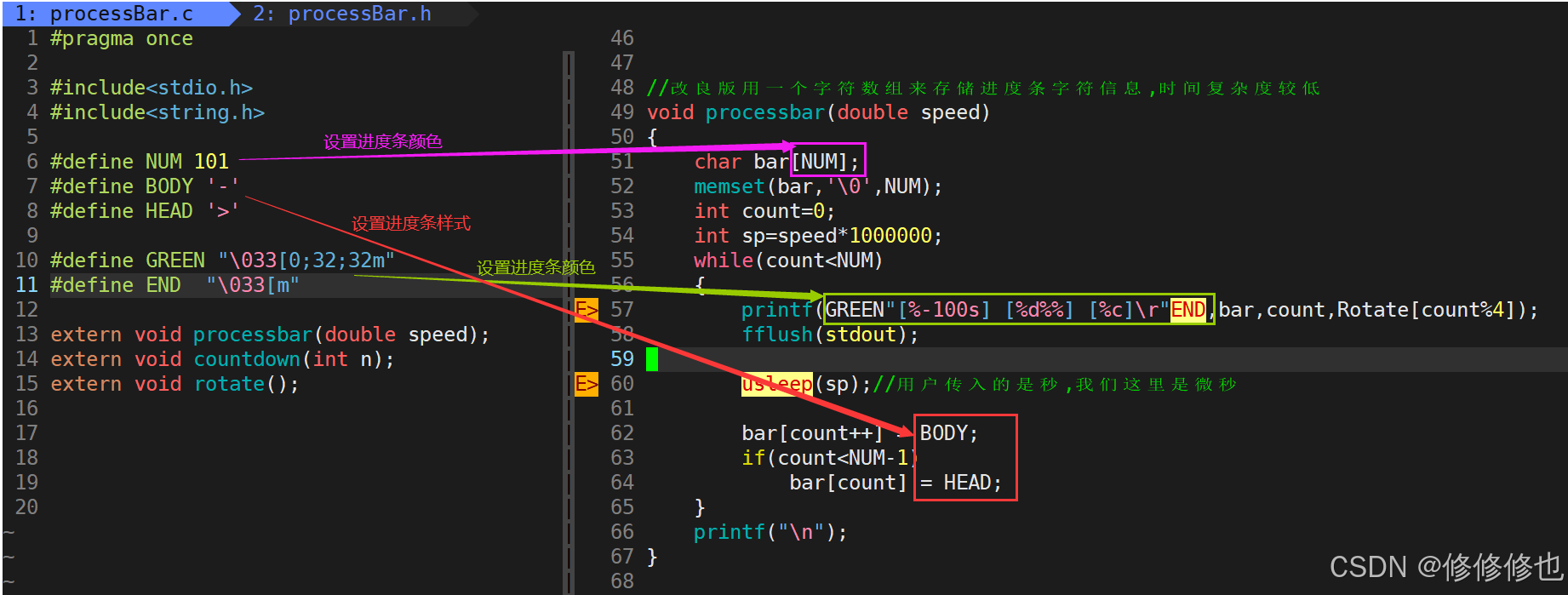 综上,函数代码如下://改良版用一个字符数组来存储进度条字符信息,时间复杂度较低
