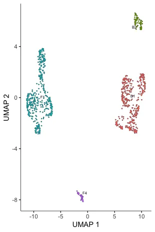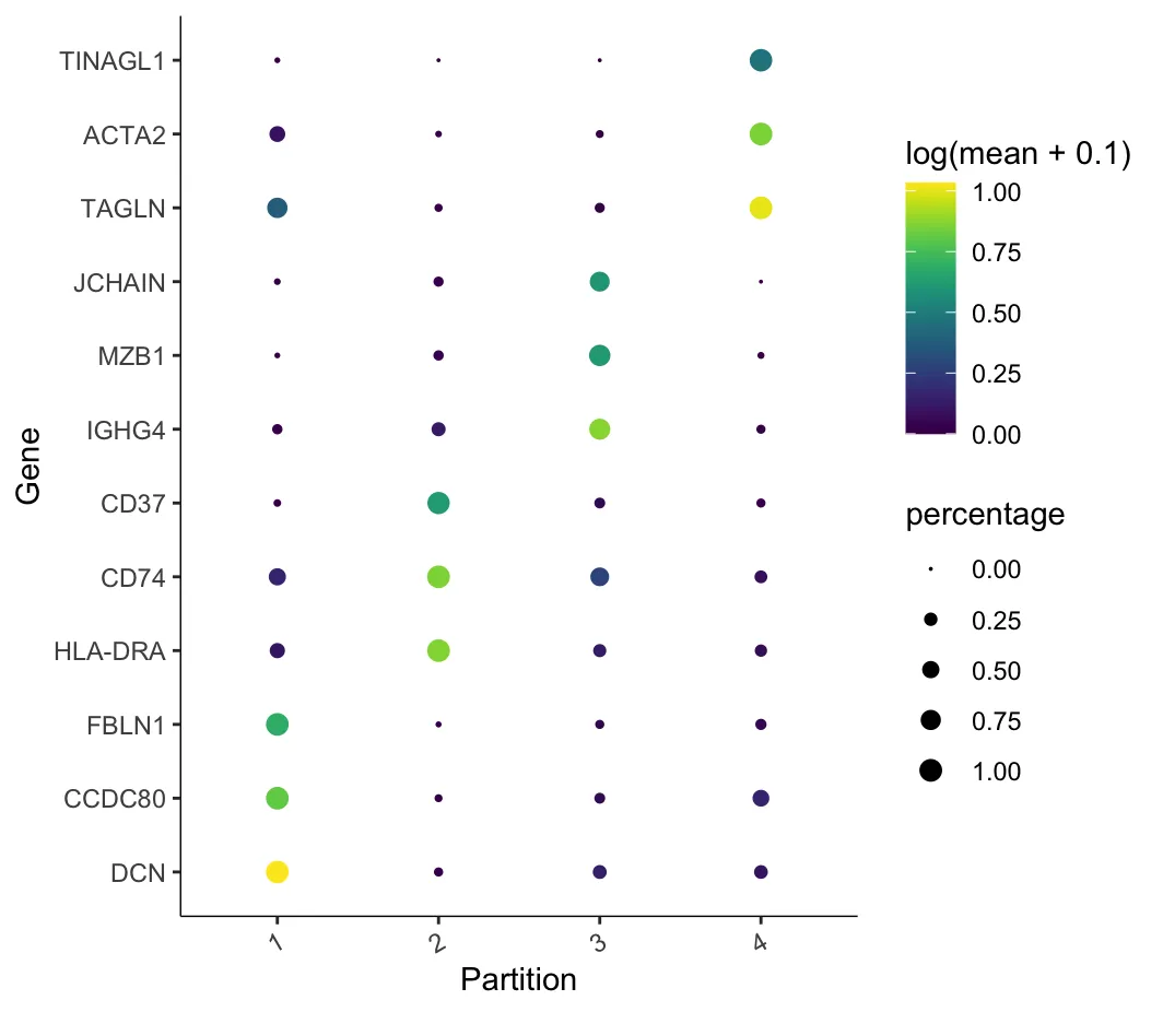 max.size=3)跟上面的图进行对比,聚类一共分了四群,其中1/4是成纤维细胞,2/3是B细胞。然后选择了每一个亚群中表达排序前3的基因进行展示。