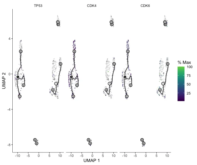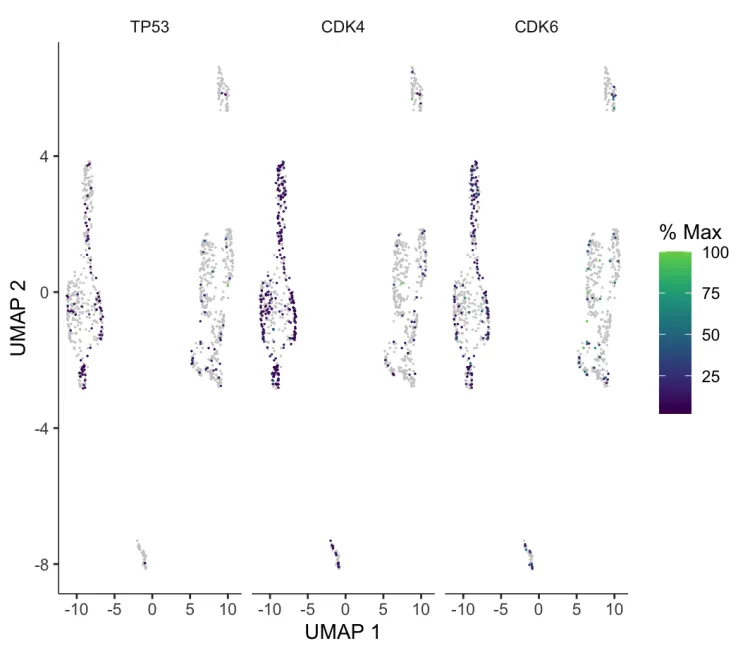 plot_cells(cds, genes=c("TP53","CDK4","CDK6"),