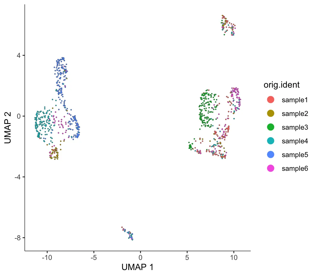 plot_cells(cds, color_cells_by="orig.ident", label_cell_groups=FALSE)开发者认为批次问题需要严格控制,因此如果下图出现单一样本占多数时,就需要进行去批次处理。