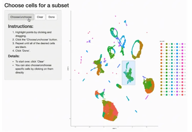 cds_subset <- choose_cells(cds)自动跳转选择起点的页面,可以把混杂细胞框选出来进一步分析(本次分析内容没有明显混杂,使用的图片是官方示例文件)