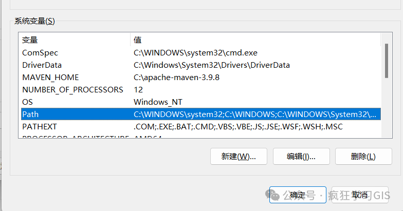 如下图所示,变量名为MAVEN_HOME,变量值就是前述大家复制好的Maven的安装路径,在我这里就是C:\apache-maven-3.9.8,如下图所示。