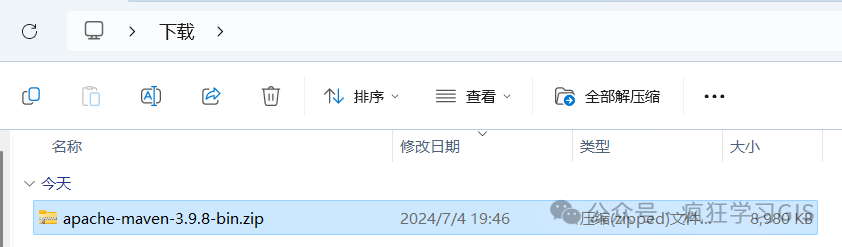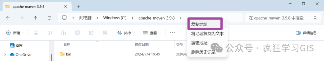 随后,将压缩包解压到某一个目录中,建议放在一个简短的路径中;这个路径相当于就是后续Maven的安装路径,如下图所示。随后,复制一下这个路径。