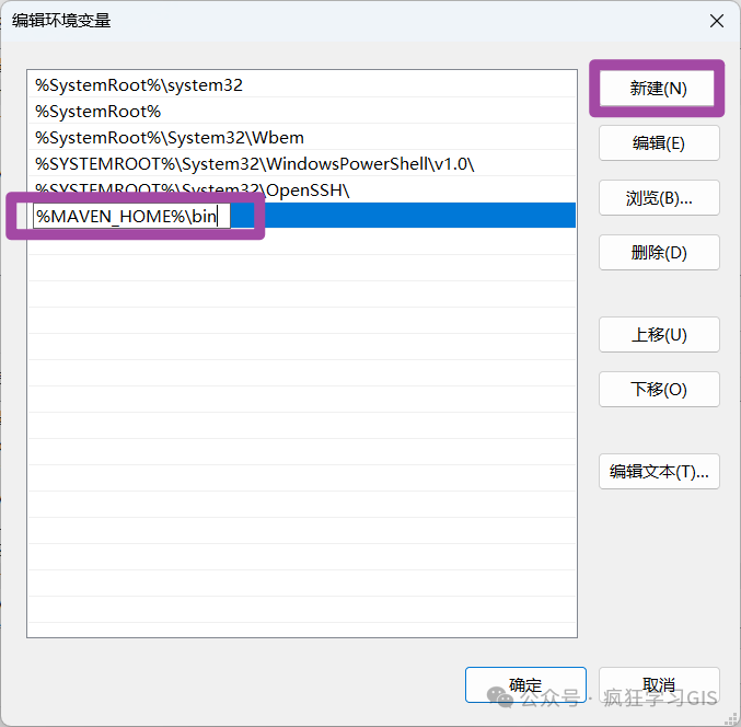 随后,新建1个变量,设置为%MAVEN_HOME%\bin,具体如下图所示。