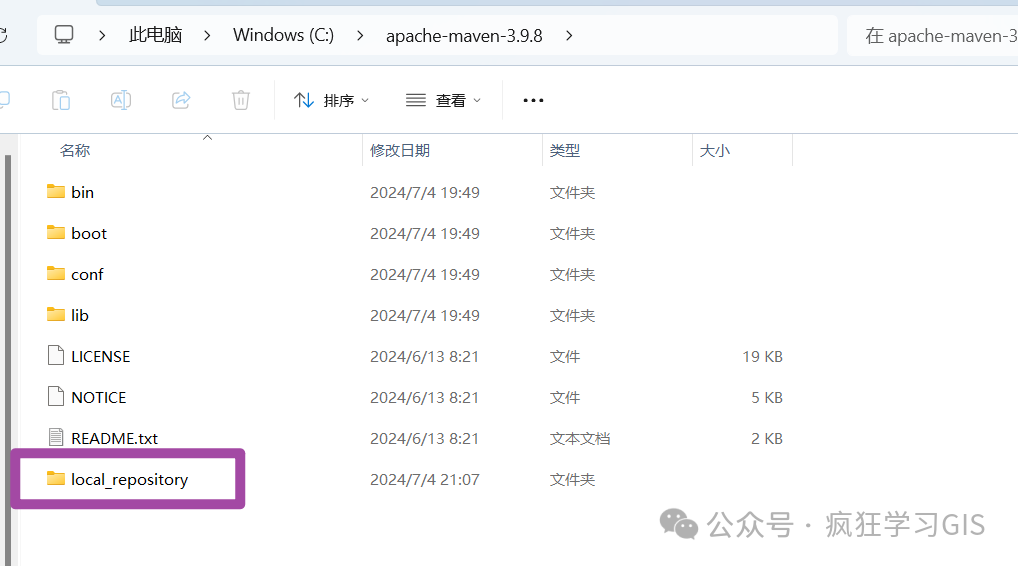 随后,我们找到前述Maven的安装路径,并新建一个文件夹,作为本地的仓库;我这里将这个文件夹命名为local_repository,如下图所示。