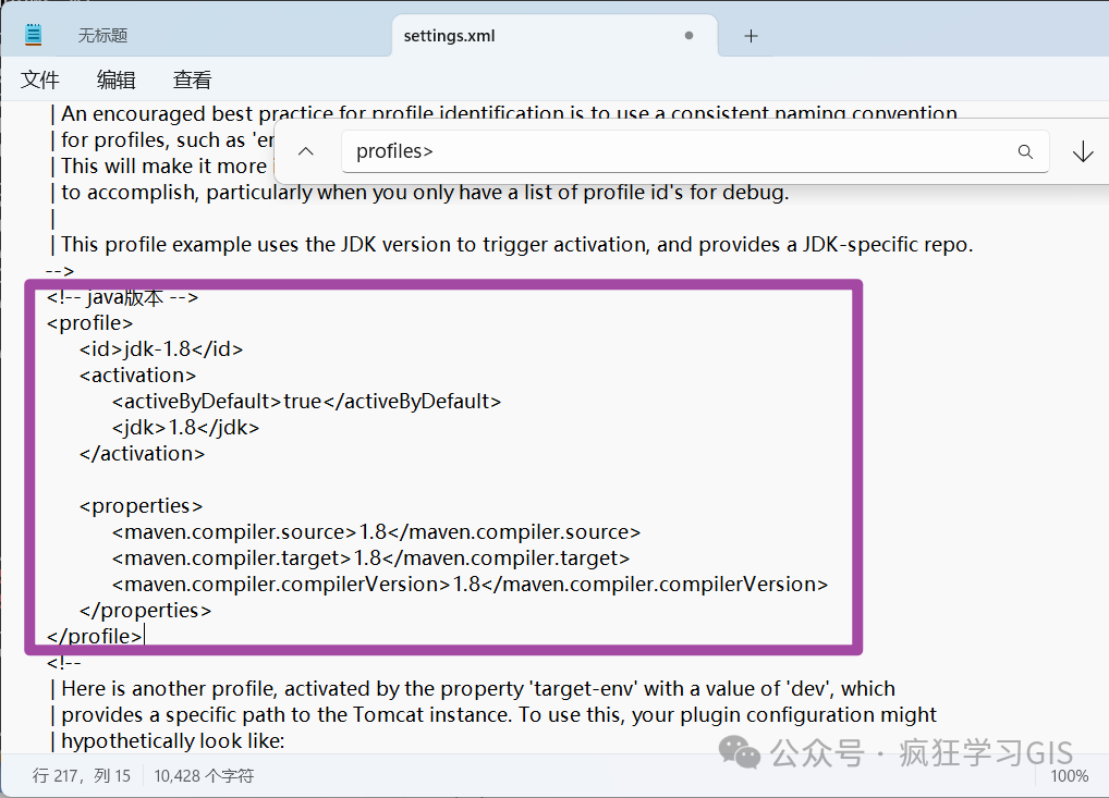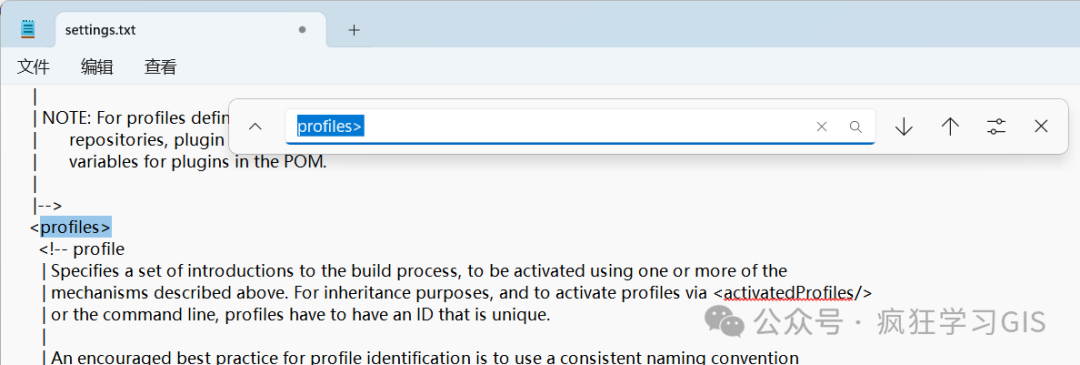 最后,我们再搜索profiles>,并找到如下图所示的位置。