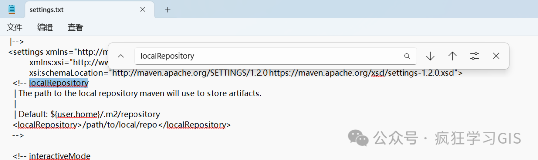首先,我们在记事本中搜索localRepository这个关键字,然后找到如下图所示的位置。