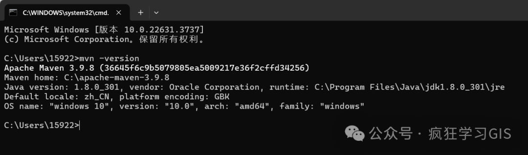 随后,在其中输入mvn -version,如果出现如下图所示的界面,则表示电脑中已经有Maven环境了,即前述配置正确。