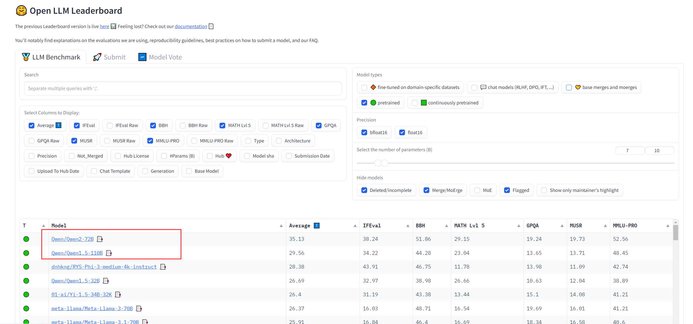 新的Qwen2系列模型在Open LLM Leaderboard榜单(在 6 个关键基准上评估模型,用于在大量不同的评估任务上测试生成语言模型)中,拿下了开源第一名的成绩,平均分达到35.13,超越国内外的一众开源大模型。