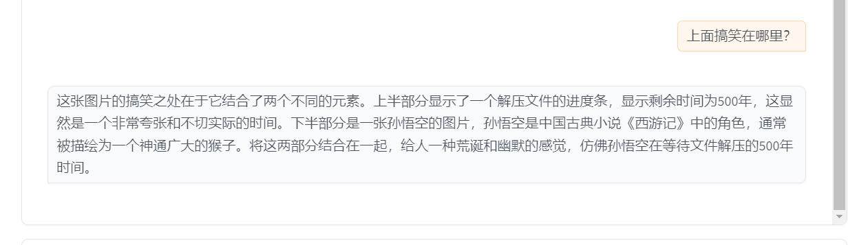 它理解到了解压文件进度条是一个非常夸张的一个东西,同时也解析了下面那张图是出自西游记的。而且最为可怕的是,Qwen2-VL真的能够理解这张图其实是在“调侃解压时间比较长”。