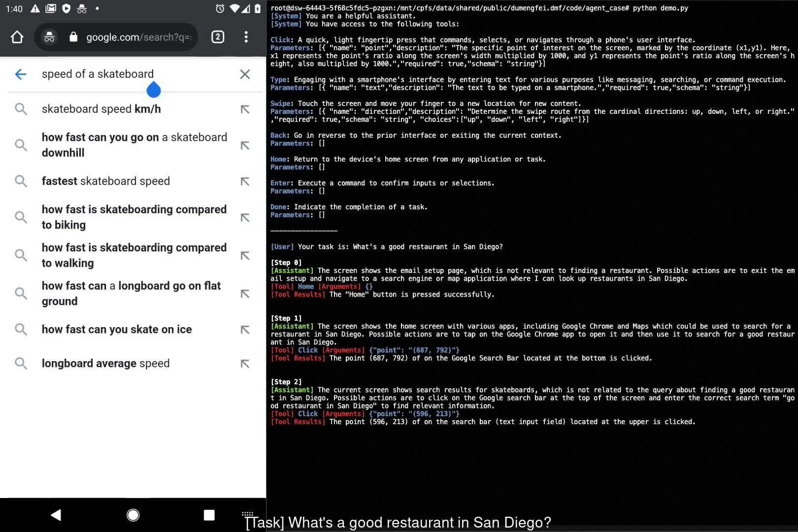 这时候需要大模型去查询一个San Diego的餐厅。可以看到AI操作谷歌搜索,然后寻找当前用户附近的餐厅。这样就可以找到心仪的餐厅了。