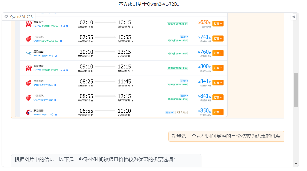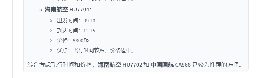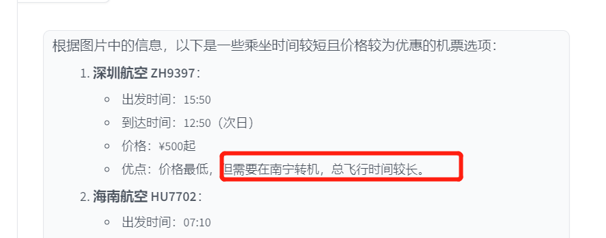 这里面问了一个机票选择问题,需要它帮我选择一个时间短且价格优惠的航班。它先是列出了每个航班的信息,这个步骤基本没有错,同时还分析了一下具体的价格和用时