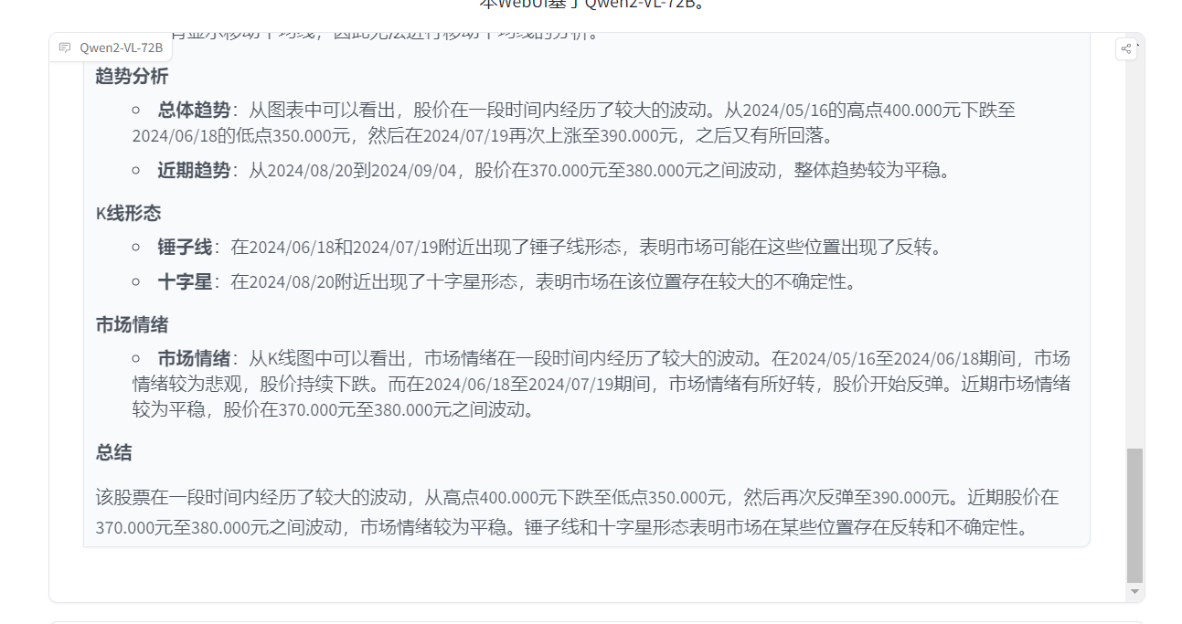 一些基础的K线信息,它能够分析出来,而且还分析了一下近期这支股票的波动情况,感觉有一点道理。
